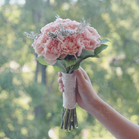 피치톤 카네이션과 백묘국 소재의 부케이며, 4계절 모두 이용이 가능한 부케입니다.