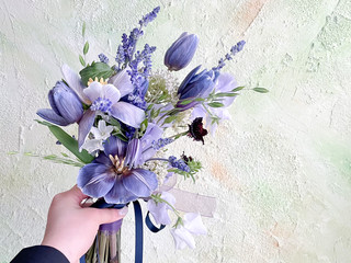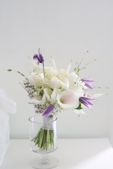 화이트 카라를 메인으로 하여 보라빛의 클레마티스로 포인트를 준 청초한 느낌의 부케입니다. 단아한 부케에 밝은 느낌 한 스푼을 더 얹은 느낌을 원하시는 신부님께 추천드립니다.