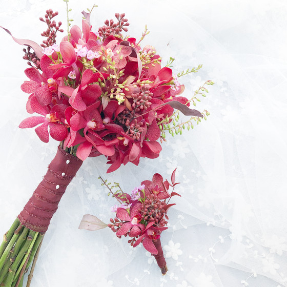 선명한 색감의 레드 모카라 부케입니다. 세련되면서도 포인트로 줄 수 있는 느낌의 부케입니다.