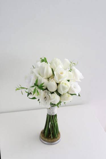 화이트 장미를 풍성하게 사용해 고급스럽고 여성스러운 느낌이 나는 부케입니다.
