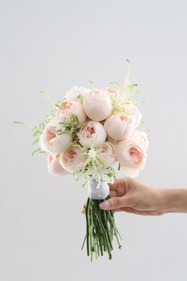 고급스러운 엠마우드 장미와 아스틸베, 화이트 옥시를 믹스한 단아하고 여성스러운 느낌의 부케입니다.